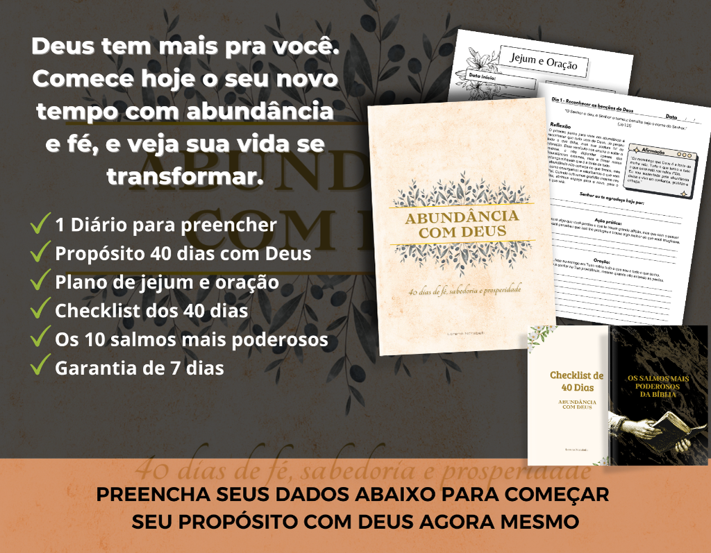 Aliança Sagrada” É Um Diário de propósito de 40 dias para restaurar sua vida amorosa com Deus. São 40 dias de orações, reflexões e atividades que fortalecem sua fé, amor-próprio e abrem seu coração para viver um relacionamento curado, leve e abençoado por Deus. Você recebe na hora pelo seu e-mail para começar quando quiser.