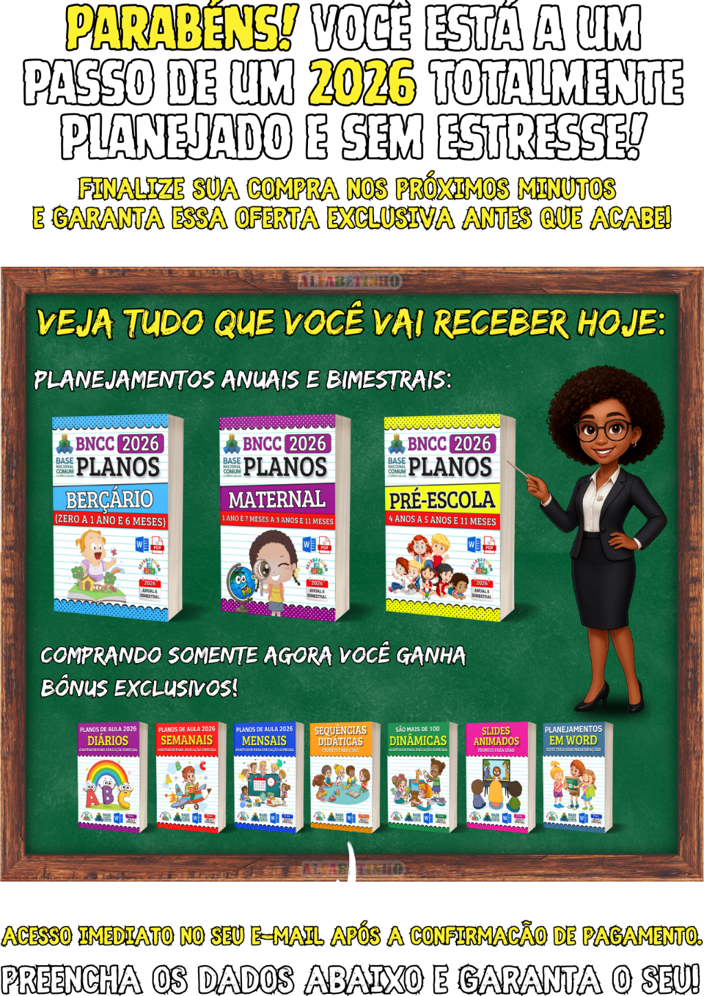 Adicione +900 Novos Planos Diários Bimestrais, contemplando TODOS OS CAMPOS DE EXPERIÊNCIA, são temas fundamentais para o ensino em sala de aula, com metodologias ativas para entregar o melhor material possível. 🎁 GANHE BÔNUS EXCLUSIVOS: 1️⃣ TODOS OS PLANOS DIÁRIOS EM WORD 2️⃣ +300 PLANOS SEMANAIS 3️⃣ +150 PLANOS MENSAIS 😱 DESCONTO IMPERDÍVEL, APENAS AGORA!