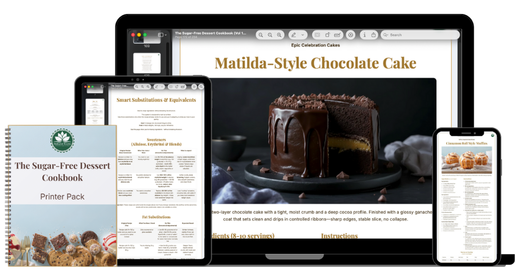 A complete sugar-free baking system + 200 desserts that actually work at home. 2 digital volumes + optional PrinterPack. Clear steps, gram measurements and doneness cues so results come out right the first time. Instant download after purchase.