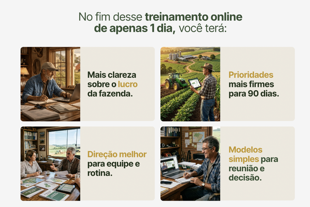 Receba a apostila + slides oficiais usados no workshop Plano do Dono 90D em PDF. É o material que orienta as decisões, define prioridades e organiza os próximos 90 dias da fazenda.