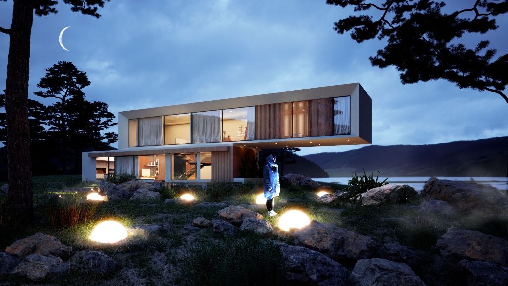 Módulo Exterior Nocturno: Renderizando una Cabaña en la montaña de noche.