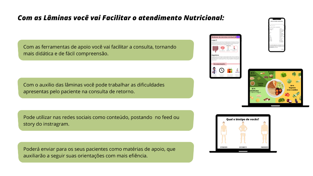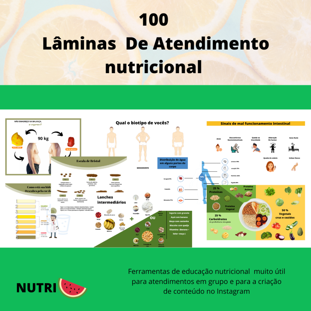 Chegamos para facilitar o seu trabalho mais de 100 lâminas com ferramentas sobre nutrição e saúda para você trabalhar com o seu paciente como necessário em consultas, grupos de emagrecimento e como material de apoio.