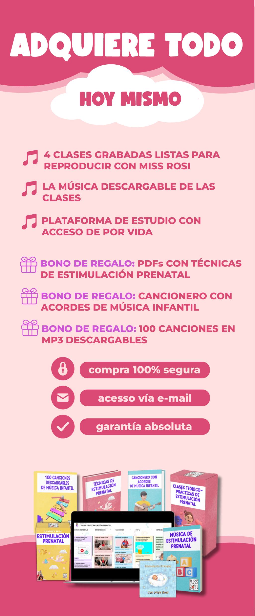 Recibirás un total de 24 videos que dicté en vivo a mis niños, son ocho clases por cada grupo de edad. - Videos de Estimulación Musical para niños de 1 a 3.5 o Nivel Básico. - Videos de Estimulación Musical para niños de 3.6 a 5 o nivel Intermedio. - Videos de Estimulación Musical para niños de 6 a 8 o nivel Avanzado. -Acceso de por vida a la plataforma del contenido. - Bonos de Regalo. Tendrás todo un repertorio musical para cuando tu bebé nazca. Descuento especial solamente comprando en esta web.