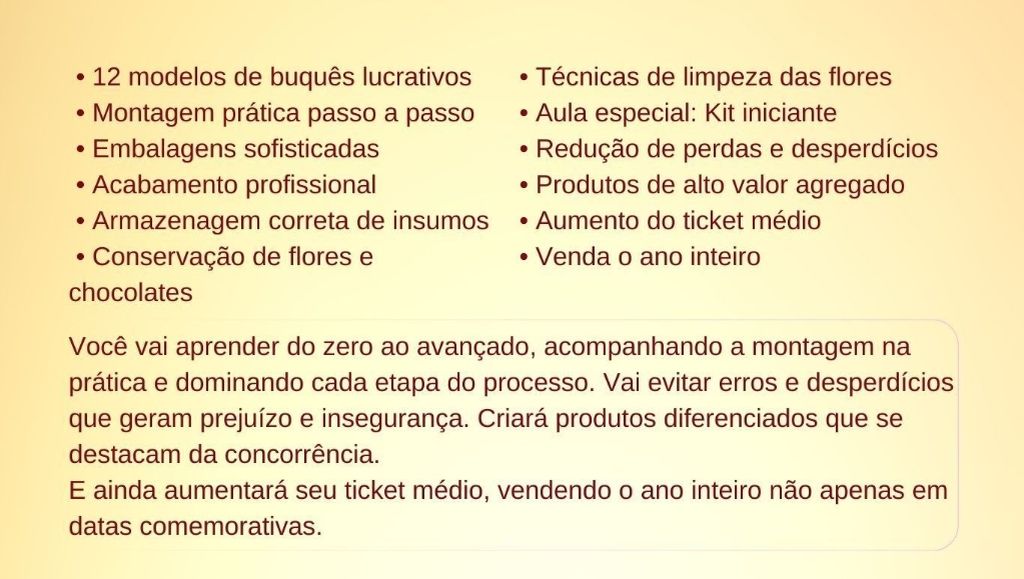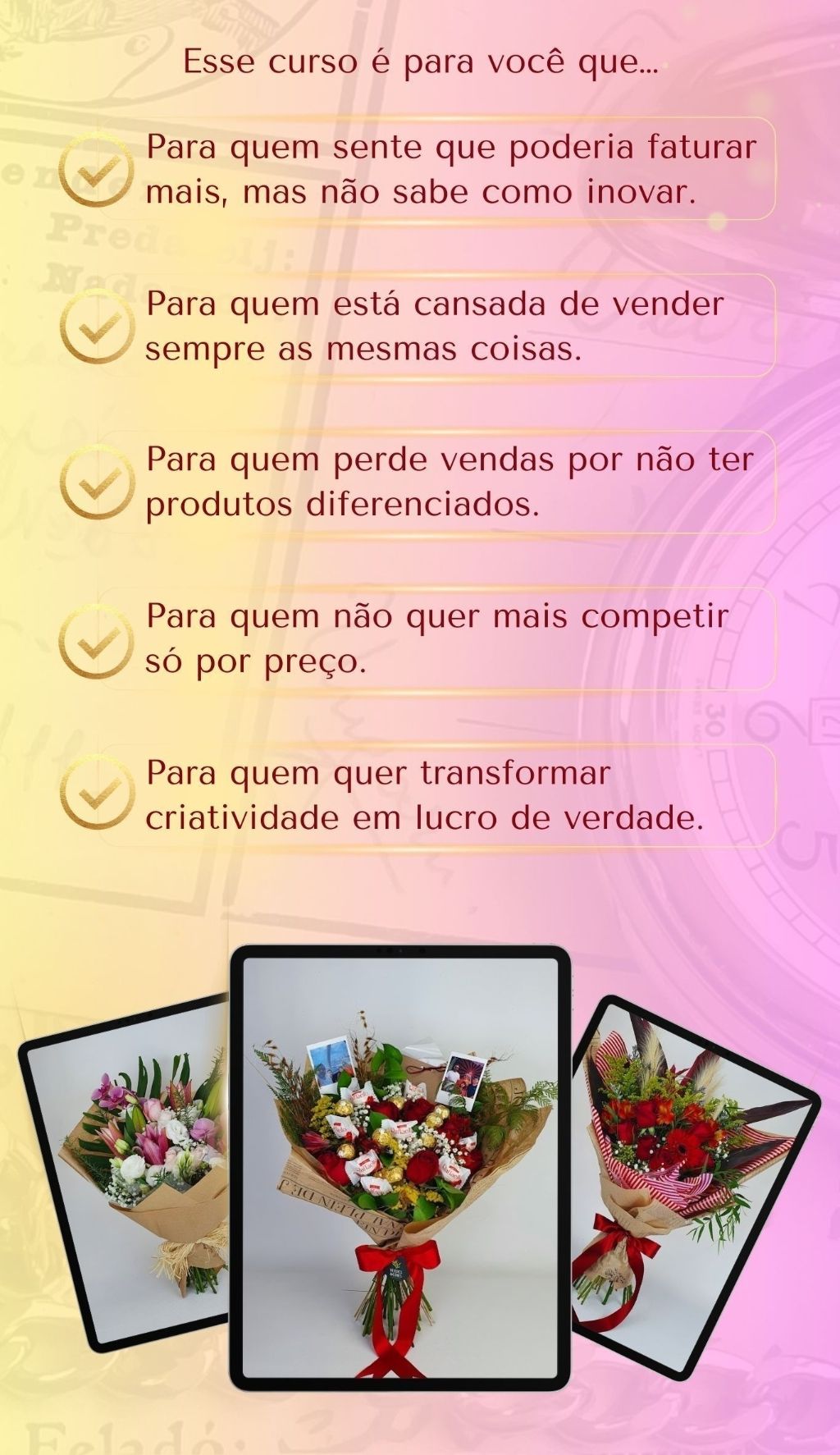 Adicione agora a Planilha de Precificação para Floriculturas Pare de vender no “achismo” e descubra o preço correto dos seus arranjos, cestas e balões. Com ela você calcula custos, margem de lucro e define valores com segurança sem prejuízo e sem medo de cobrar. Mais clareza, mais lucro, menos erro.
