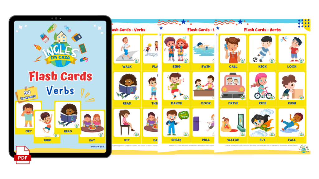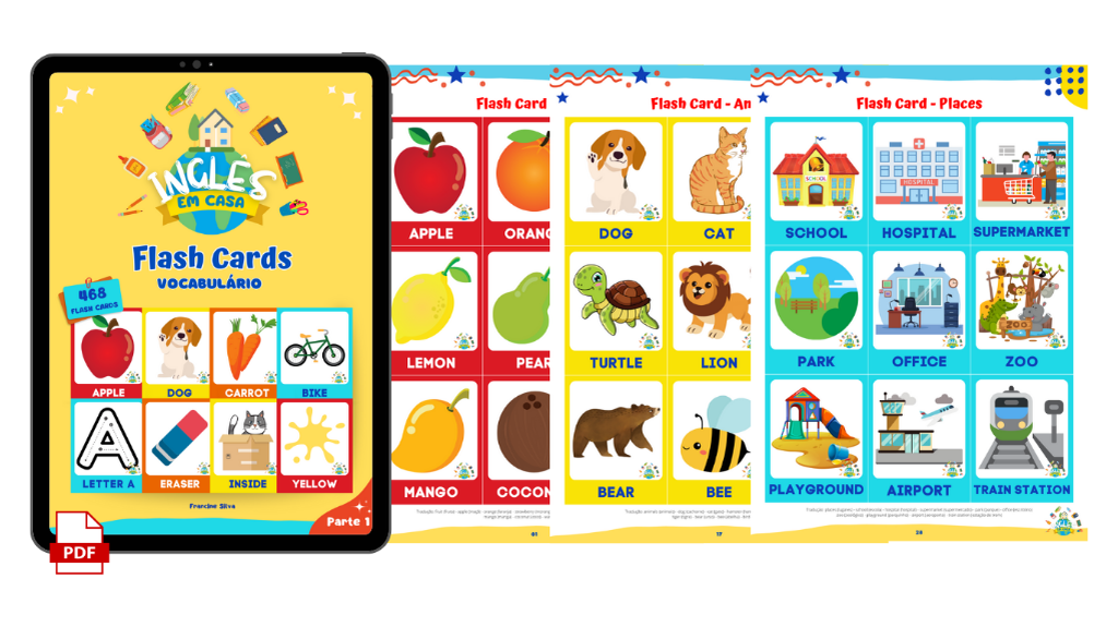 Arquivo em PDF com 92 páginas e 792 flash cards, com tradução, áudio e mais de 15 temas, entre: alfabeto, números, cores, animais, vestuário, comidas, escola e muito mais... É uma excelente maneira da criança adquirir vocabulário em inglês, de forma divertida através das ilustrações.