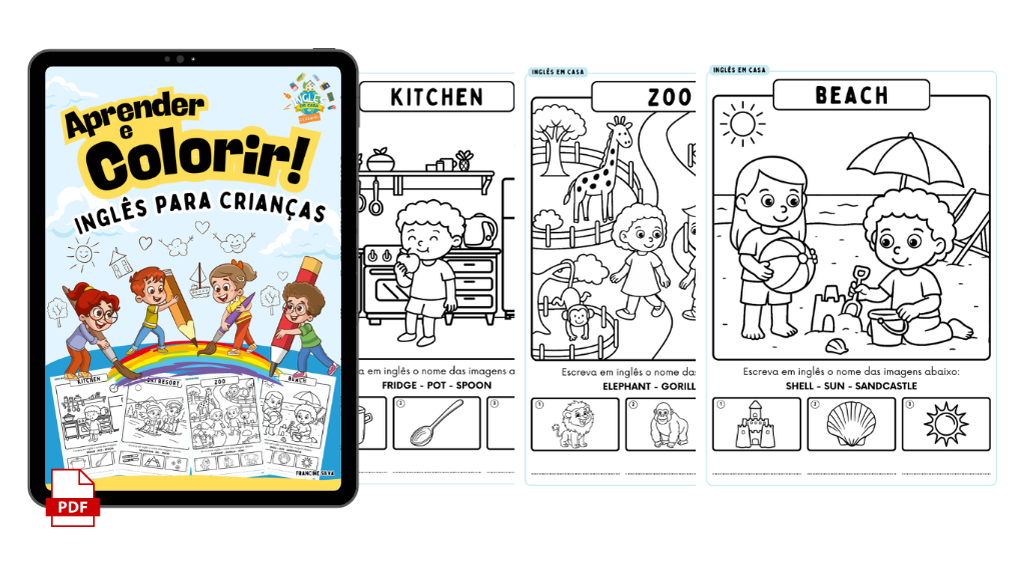 eBook com 30 ilustrações para colorir, cada uma acompanhada de 3 vocabulários em inglês relacionado ao desenho, para a criança praticar a escrita. Os temas são variados e envolventes, como: Cozinha, Quarto, Banheiro, Parque de diversões, Hospital, Biblioteca, Estação de trem, Zoológico e muito mais! Tradução e áudio para auxiliar na pronúncia.