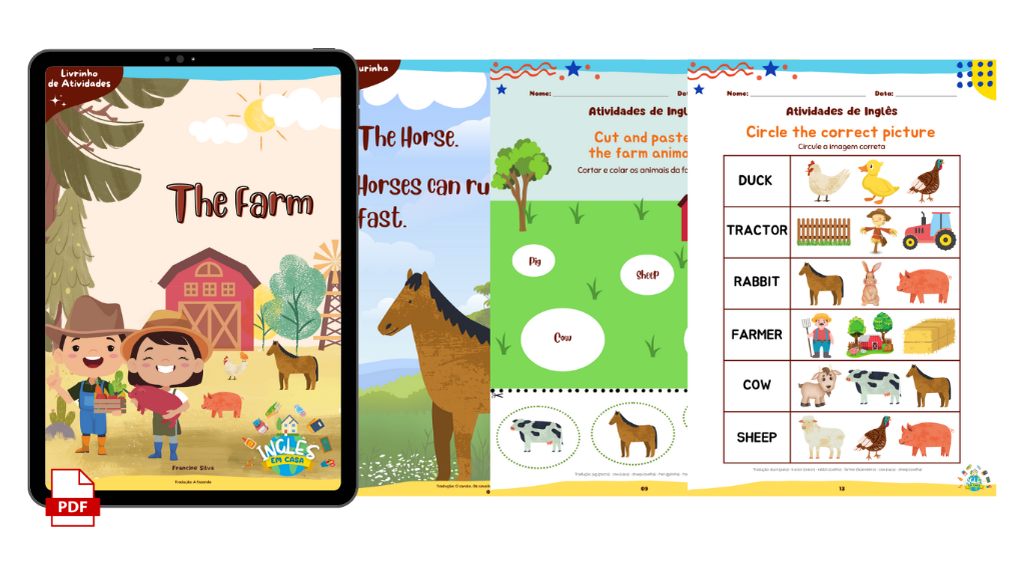 São 38 páginas para a criança praticar a leitura e atividades de inglês com o tema Fazenda. Com jogo da memória, tradução e áudio! A criança irá adquirir vocabulário sobre o tema fazenda, praticar a leitura e se divertir com o jogo da memória. Com tradução e áudio.
