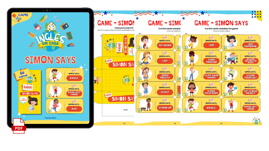 O Tradicional jogo 'o Mestre Mandou' em inglês é 'Simon Says'. A criança irá adquirir vocabulário se divertindo. Arquivo em pdf com 50 cartas com comandos, com tradução e áudio. onde a criança além de adquirir vocabulário, irá desenvolver a escuta e a fala do inglês, pois ela ouvirá os comandos e terá que falar quando for sua vez de ser o 'Simon'. Uma excelente maneira de aprender e praticar o inglês! Com tradução e áudio para auxiliar a pronúncia dos comandos.