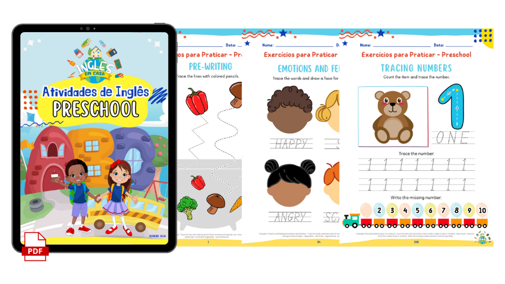 São 200 atividades pré-escolar para a criança iniciar o ensino do inglês! O eBook possui atividades de pré-escrita, as quais desempenham um papel fundamental no desenvolvimento infantil, e a criança ainda irá adquirir muito vocabulário em inglês, com temas como: alfabeto, números, animais, família, cores, formas geométricas, comidas, veículos, emoções, memory game e flash cards.