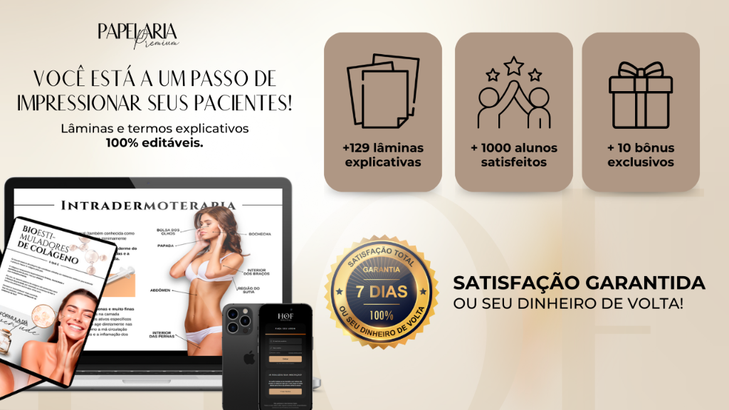 Complemente a sua aquisição da Papelaria HOF Premium com esse pacote exlcusivo de + 30 lâminas explicativas de altas tecnologias e bioremodeladores. Endolaser, ultrasom microfocado, bioremodeladores, laser thulium e muito mais...