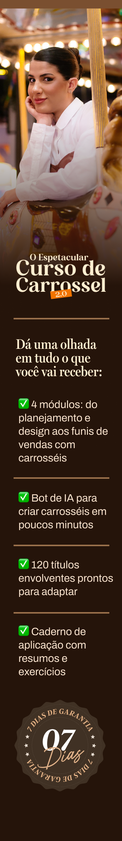 [OPORTUNIDADE ÚNICA – ACESSO ATÉ 2027] O acesso ao Espetacular Curso de Carrossel 2.0 é de 12 meses. Clicando aqui, você garante + 1 ano de acesso a todas as aulas e futuras atualizações. Com isso, você poderá reassistir às aulas e aplicar tudo no seu ritmo. 💡 Garanta mais 12 meses de acesso e continue evoluindo com o método que transforma carrosséis em vendas.