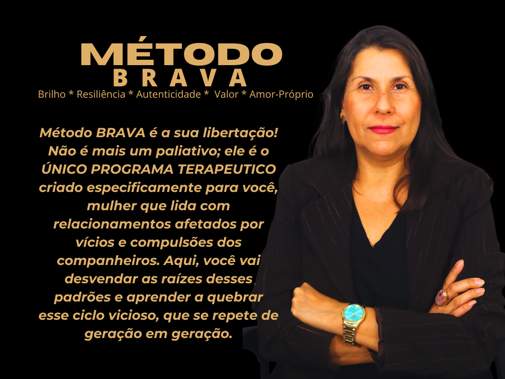 Mas o Método BRAVA é a sua libertação! Não é mais um paliativo; ele é o ÚNICO PROGRAMA TERAPEUTICO criado especificamente para você, mulher que lida com relacionamentos afetados por vícios e compulsões dos companheiros. Aqui, você vai desvendar as raízes desses padrões e aprender a quebrar esse ciclo vicioso, que se repete de geração em geração.