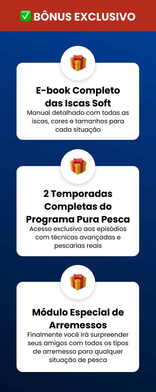 [93% TAMBÉM COMPRARAM] Pegar mais peixe não é sorte — é técnica! No ABC das Iscas Artificiais, você aprende a escolher e usar a isca certa na hora certa, com os movimentos certos, em qualquer situação. Aumente suas chances de fisgada e transforme cada saída em uma pescaria de verdade. Domine as estratégias que os pescadores experientes não contam. Garanta agora e comece a pescar com inteligência! ESSA OFERTA ESTÁ DISPONÍVEL APENAS AQUI
