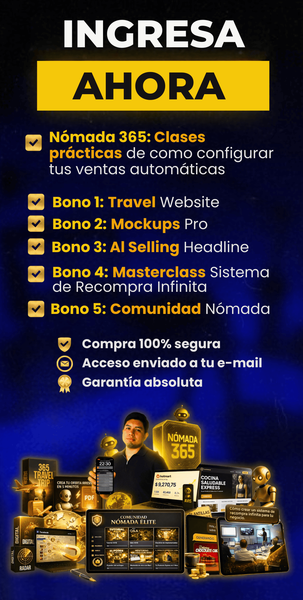 Usarás mi Inteligencia Artificial que será tu Asistente virtual y cree tu producto express en 5 minutos, crea anuncios en minutos sin que seas diseñador y configura tu sistema de ventas automática y puedas obtener hasta 5 veces más resultados con menos esfuerzo y en la mitad de tiempo. *(Esta promoción no está disponible para comprar EN NINGUN OTRO LUGAR)