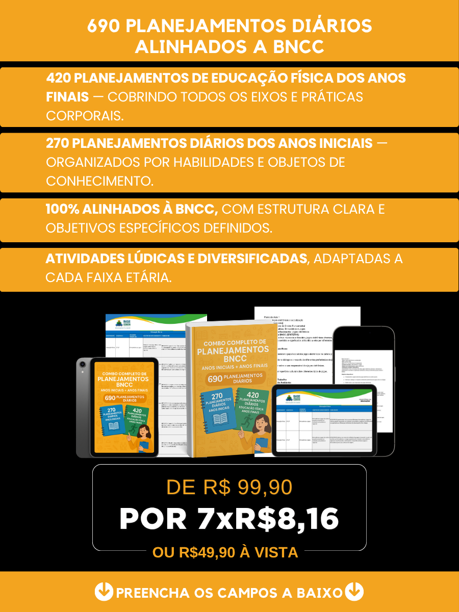 Combo com 4 e-books de Educação Física Escolar, reunindo 914 atividades prontas, organizadas da Educação Infantil ao Ensino Médio e alinhadas à BNCC. Inclui propostas variadas para o dia a dia escolar, Ensino Fundamental II, Ensino Médio e atividades adaptadas para espaços reduzidos ou uso em casa. Ideal para ampliar o repertório, evitar aulas repetitivas e facilitar o planejamento do professor.