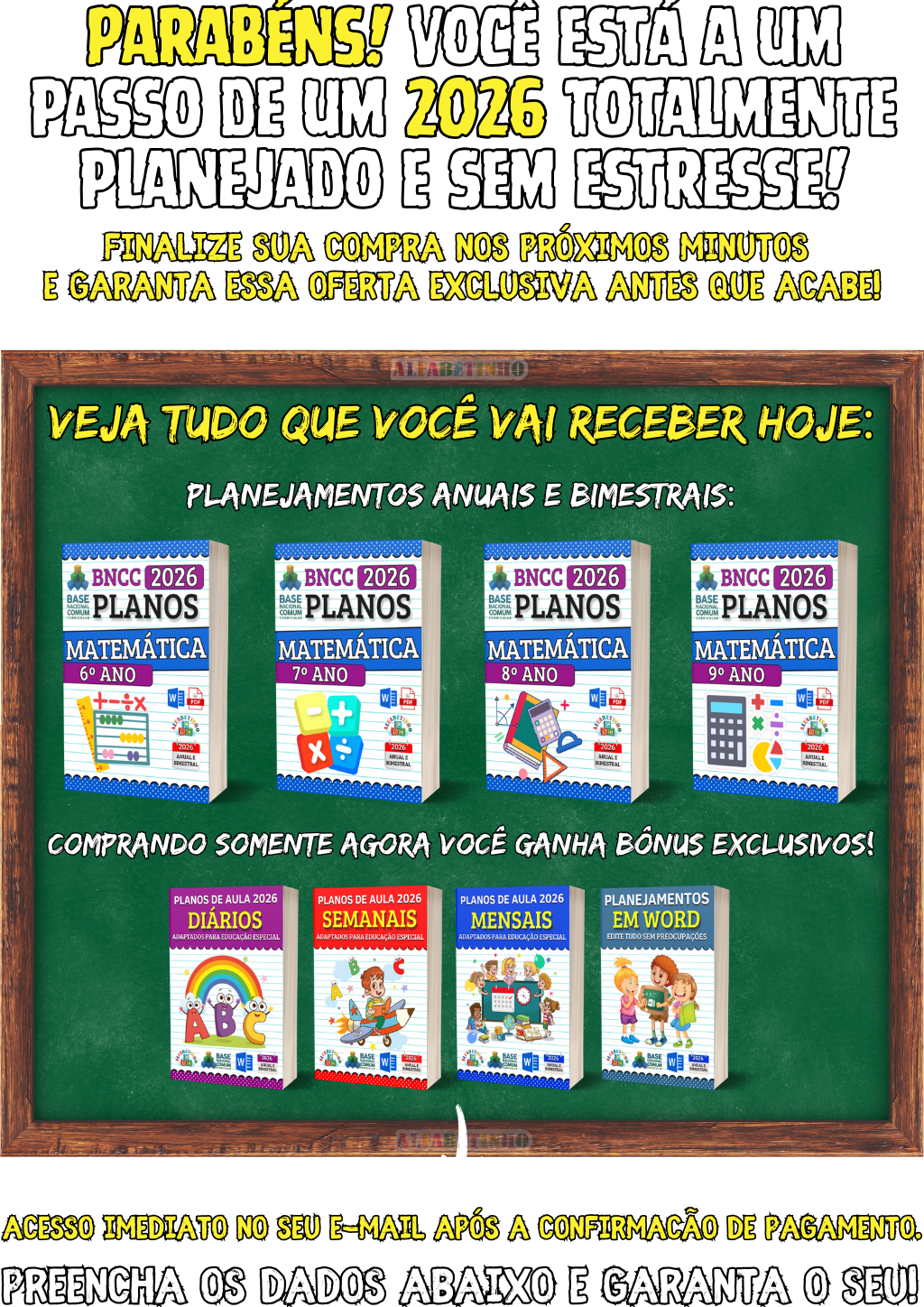 512 Atividades, todas organizadas por Ano e Bimestre, de acordo com a BNCC 2026. perfeitas para uso imediato. 🎁 GANHE BÔNUS EXCLUSIVOS: 1️⃣ ATIVIDADES EM WORD 2️⃣ GABARITOS DAS ATIVIDADES 3️⃣ 32 PLANOS DIÁRIOS 4️⃣ 24 PLANOS SEMANAIS 5️⃣ 16 PLANOS MENSAIS 😱 DESCONTO IMPERDÍVEL, APENAS AGORA!