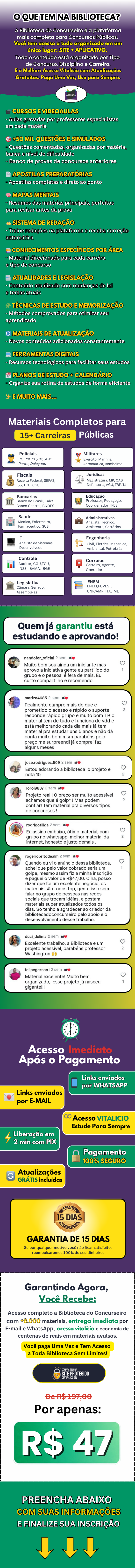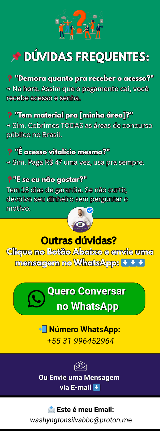 Receba novos materiais toda semana, participe de um grupo de estudos no WhatsApp, peça conteúdos específicos e estude com apoio de outros concurseiros no mesmo objetivo.