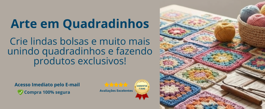 Leve também: O segredo do acabamento perfeito! Quer que seus quadradinhos fiquem impecáveis, retos e fáceis de montar? A blocagem é o "pulo do gato" das grandes artesãs para eliminar bordas enroladas e garantir simetria total. Com o ebook "A Arte da Blocagem", você domina as técnicas profissionais para valorizar suas peças e dar aquele visual de vitrine que as clientes amam. É o complemento indispensável para quem busca excelência. Adicione agora e eleve o nível do seu crochê!