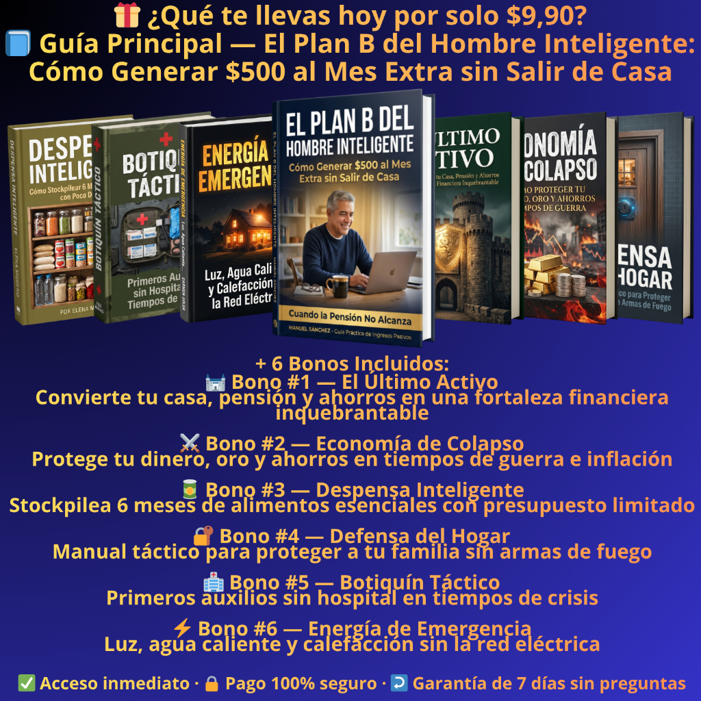 Trabajaste 40 años. Hiciste todo bien. Y aun así, en el fondo, sabes que si la pensión se retrasa un mes — o se reduce — no sabes exactamente qué harías. Esa incertidumbre no es debilidad: es la consecuencia de nunca haber tenido un plan concreto para ese momento. Este manual te da el diagnóstico de tu déficit real, los beneficios que ya son tuyos y el protocolo paso a paso para los primeros 7 días si algo falla.