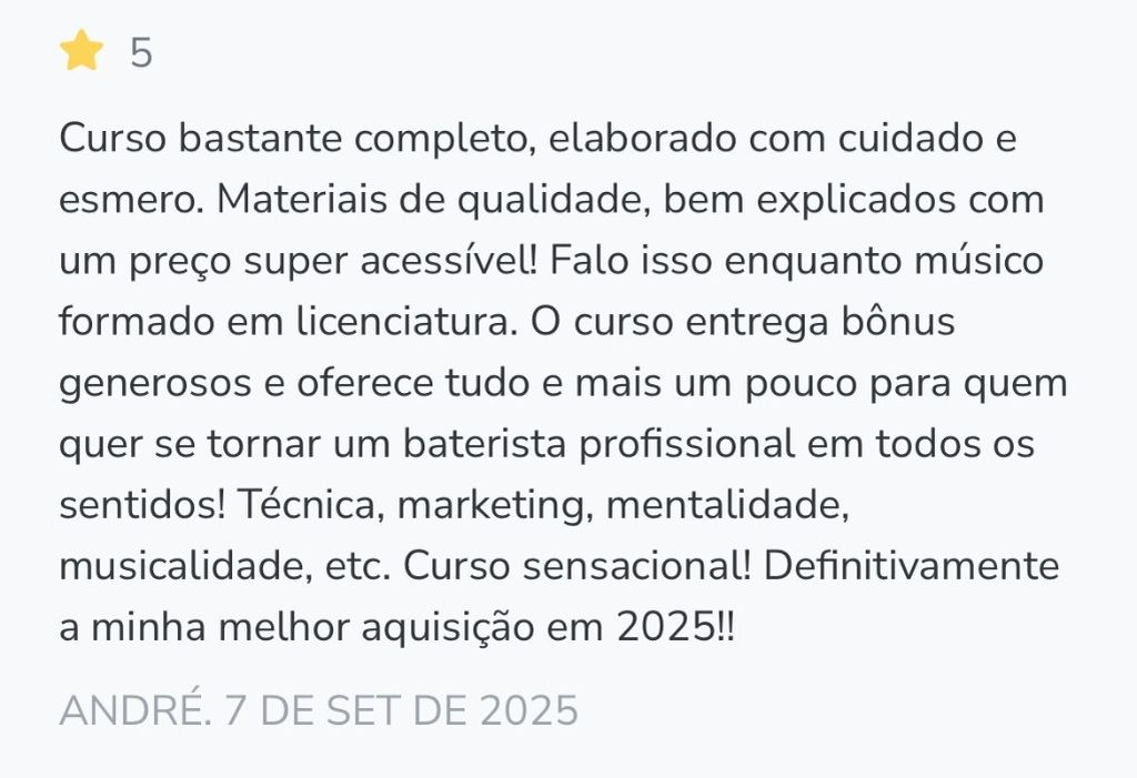 [OFERTA OUTUBRO 2025 - somente nessa página] [Material complementar de estudo] Apostila em PDF com 112 páginas com mais de 1.000 exercícios divididos num período de prática de 28 dias. Destrave suas mãos de uma vez por todas, tanto na qualidade dos toques quanto na velocidade e controle de baquetas. Material simples e eficaz!