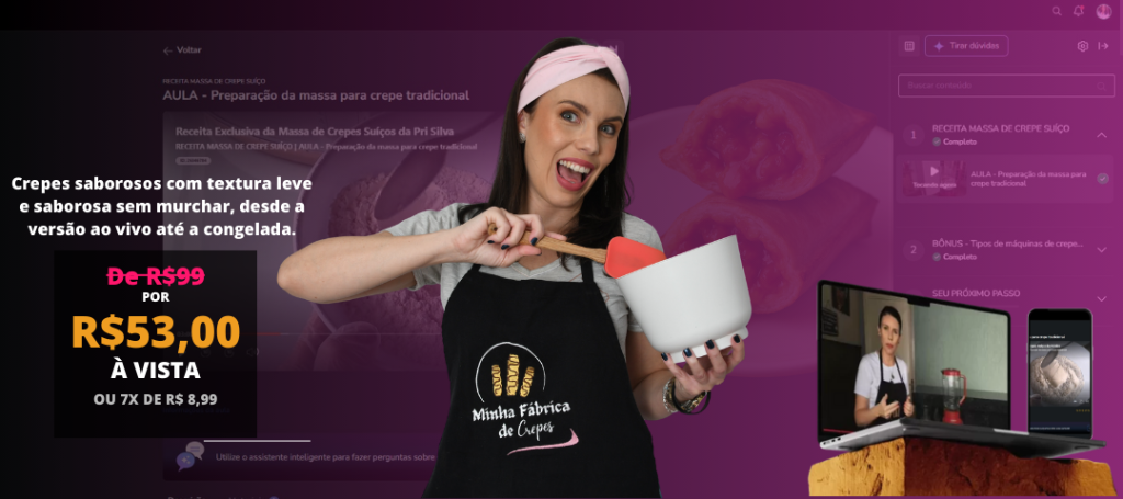 Módulo com a minha receita exclusiva da massa de crepe suíço, com lista de ingredientes, suas quantidades, toda preparação e conservação.
