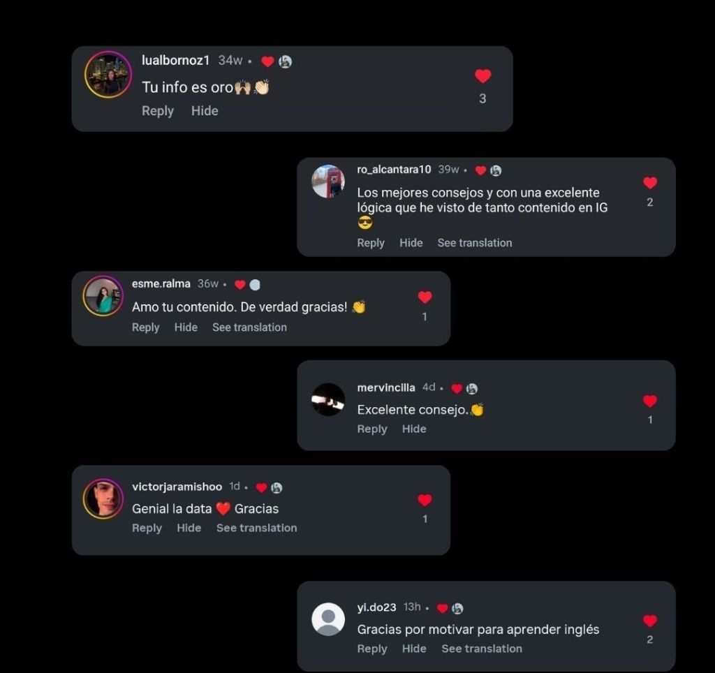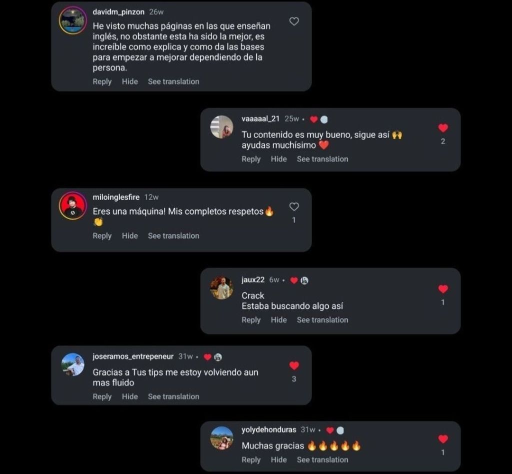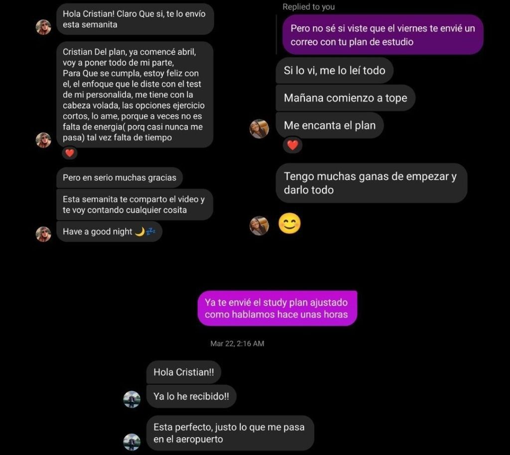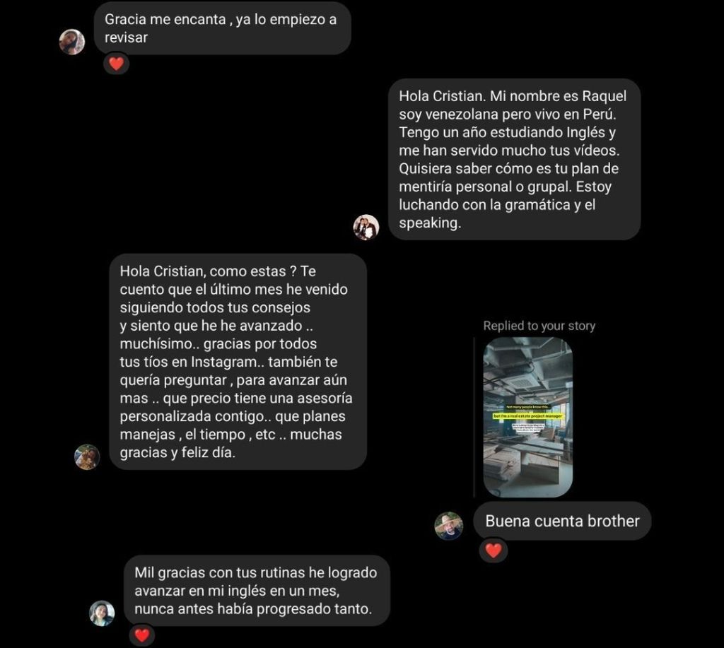 "Empecé un proceso personalizado con él y ha sido lo mejor del mundo. yo era de las que pensaba que debía ir a una academia o viajar fuera del país para hablar inglés, pero Cristian de verdad me demostró que se puede hablar inglés en tres meses. No lo hablo perfecto, pero he mejorado muchísimo gracias a él. De verdad vale la pena."