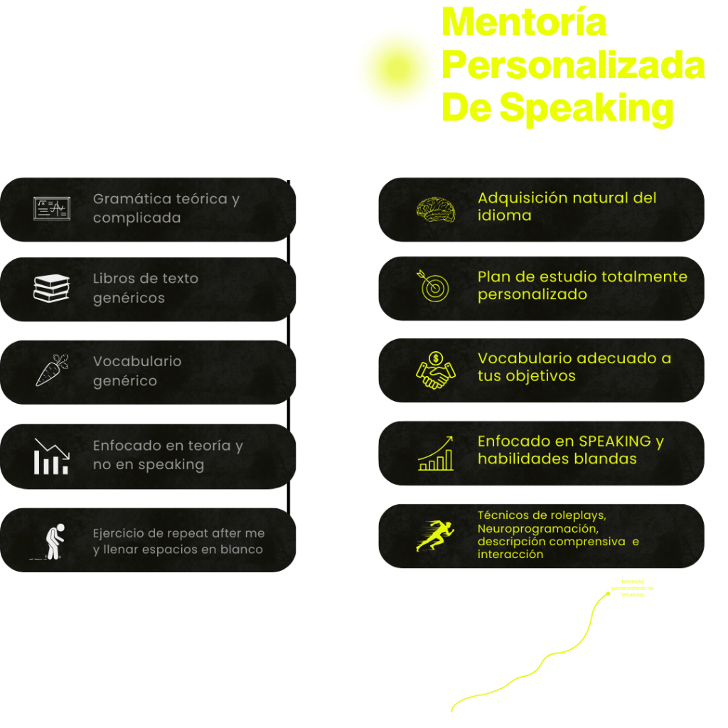 De todo un acompañamiento con un enfoque personalizado PARA HABLAR INGLÉS. Un proceso enfocado 100% en el SPEAKING.