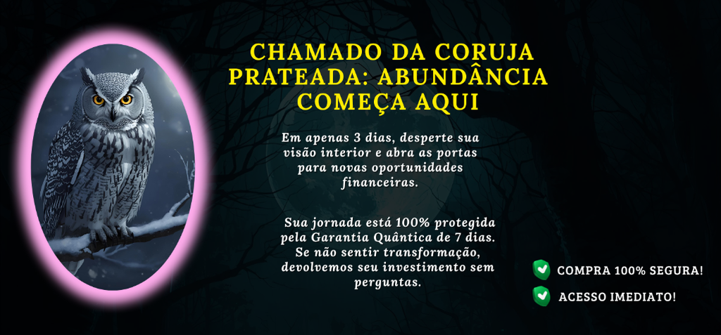 📝 Diário da Abundância Não deixe seus sinais passarem despercebidos! Com este diário exclusivo de 21 dias, você vai registrar cada manifestação, intuição e conquista durante o Ritual da Coruja. ➡️ Isso multiplica sua clareza e acelera sua prosperidade. ✨ Por apenas R$19, transforme sua jornada em uma linha direta com o universo. ✅ Sim, quero meu Diário da Abundância!