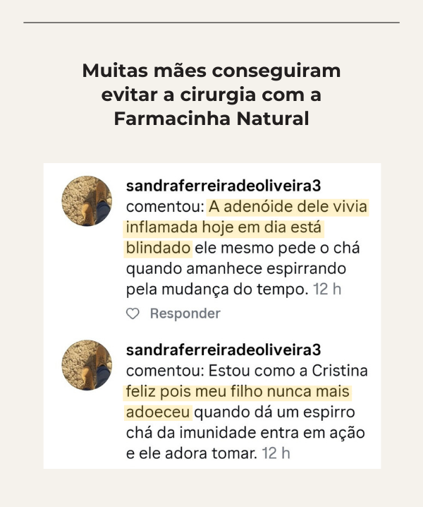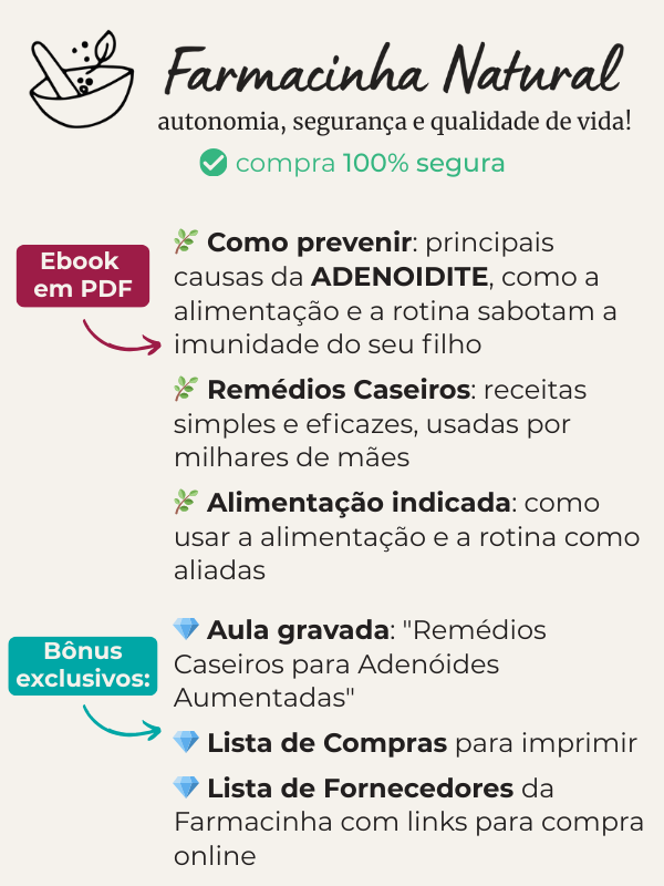 Um eBook completo com receitas fáceis, usando ingredientes que você já tem em casa. Tudo explicado passo a passo, para que você saiba o que fazer assim que os primeiros sintomas aparecerem, mesmo que nunca tenha usado remédios caseiros antes. Bônus especiais: 💎 Aula gravada: "Como usar a Farmacinha Natural para bebês e crianças pequenas" 💎 Lista de Compras para imprimir 💎 Lista de Fornecedores da Farmacinha com links para compra online - Ao sair desta página a oferta expira -