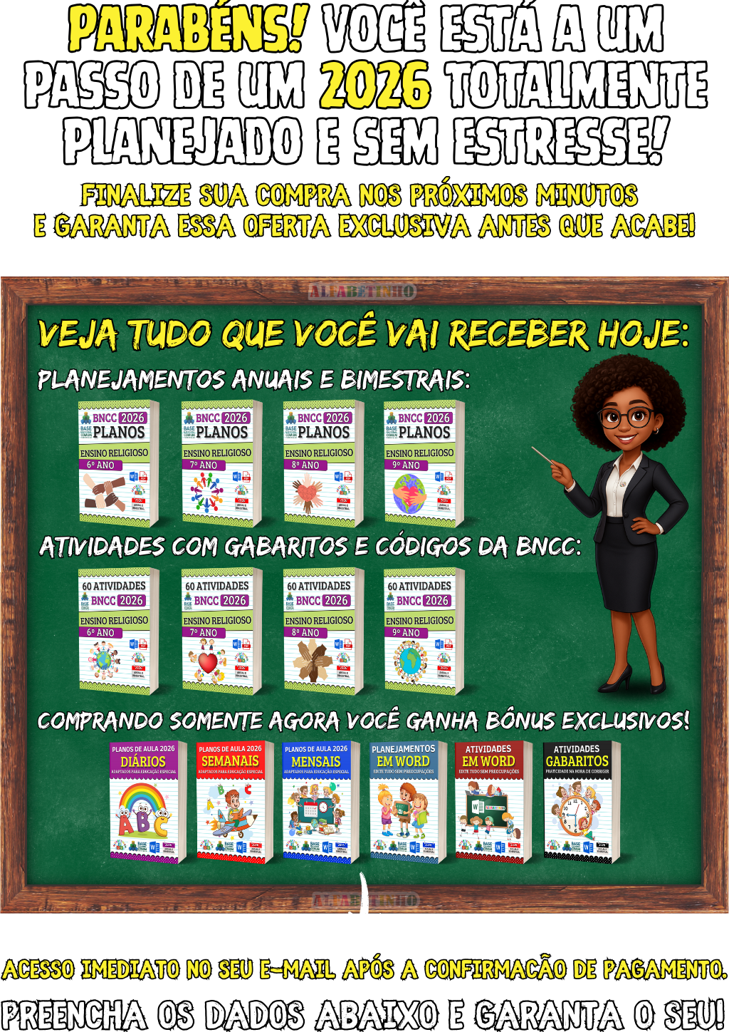 180 Atividades e 180 Planejamentos, todos organizados por Ano e Bimestre, perfeitas para uso imediato. 🎁 GANHE BÔNUS EXCLUSIVOS: 1️⃣ PLANEJAMENTOS EM WORD 2️⃣ ATIVIDADES EM WORD 3️⃣ GABARITOS DAS ATIVIDADES 😱 DESCONTO IMPERDÍVEL, APENAS AGORA!