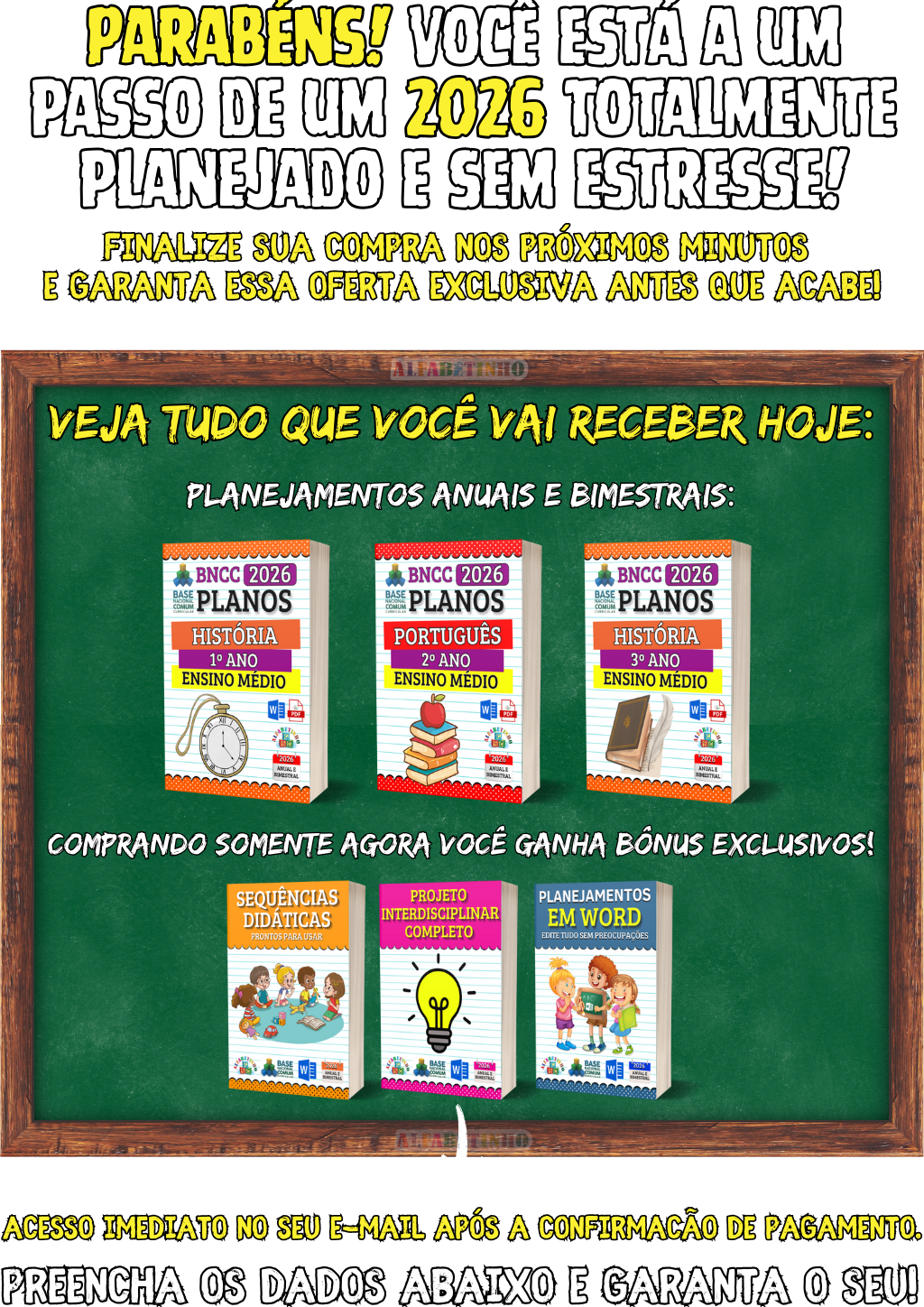 512 Atividades e 400 Planejamentos, todos organizados por Ano e Bimestre, de acordo com a BNCC 2026. perfeitas para uso imediato. 🎁 GANHE BÔNUS EXCLUSIVOS: 1️⃣ PLANEJAMENTOS EM WORD 2️⃣ ATIVIDADES EM WORD 3️⃣ GABARITOS DAS ATIVIDADES 4️⃣ 32 PLANOS DIÁRIOS 5️⃣ 24 PLANOS SEMANAIS 6️⃣ 16 PLANOS MENSAIS 😱 DESCONTO IMPERDÍVEL, APENAS AGORA!