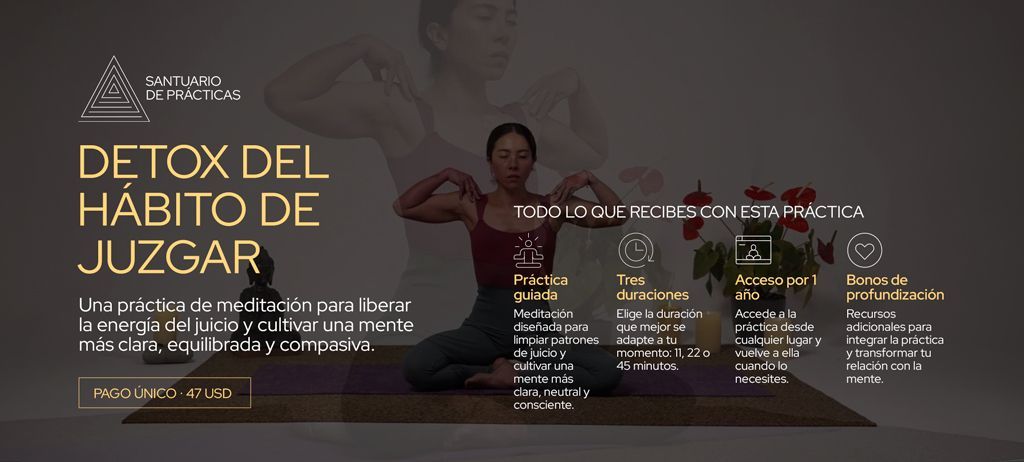 Accede a las dos primeras prácticas del Santuario: • El Brillo Radiante del Corazón • Detox del Hábito de Juzgar Dos caminos complementarios para trabajar con el corazón y con la mente. Pago único: