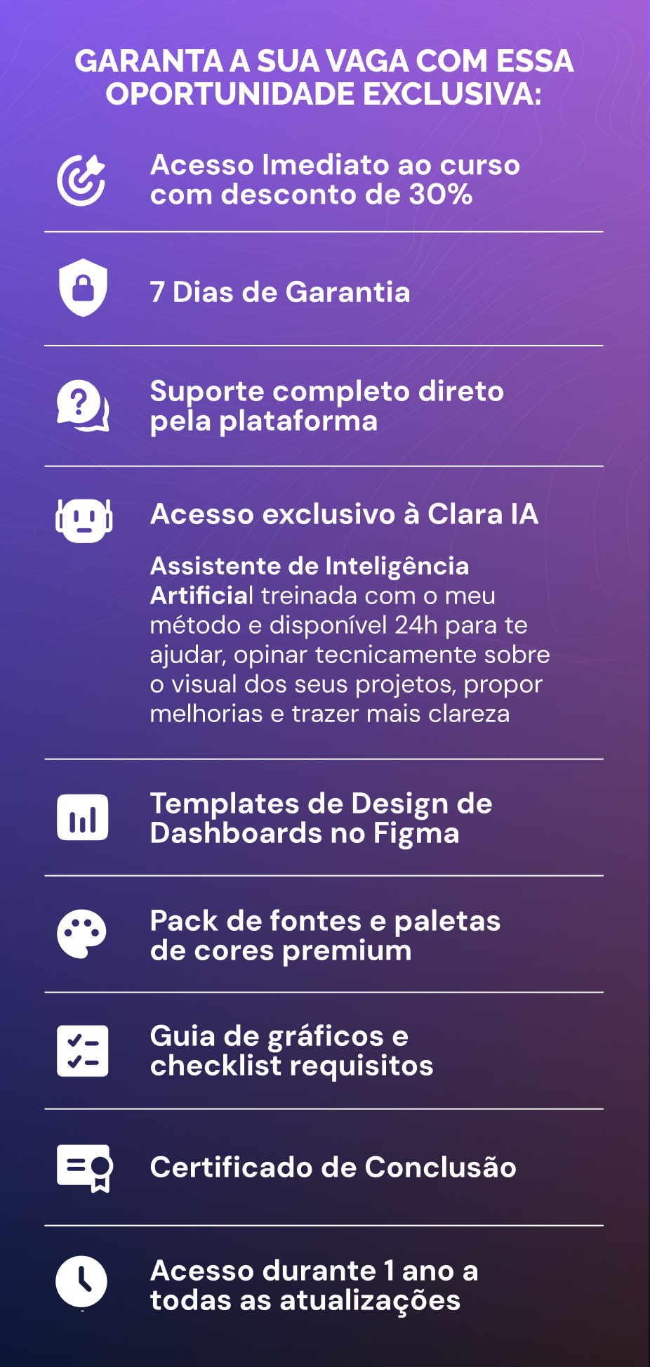 Mais 1 ano de acesso com 79% OFF. Transforme seu acesso em 2 anos completos ao curso de Dashboard Design e tenha tempo de sobra para aplicar, revisar e amadurecer seu design.
