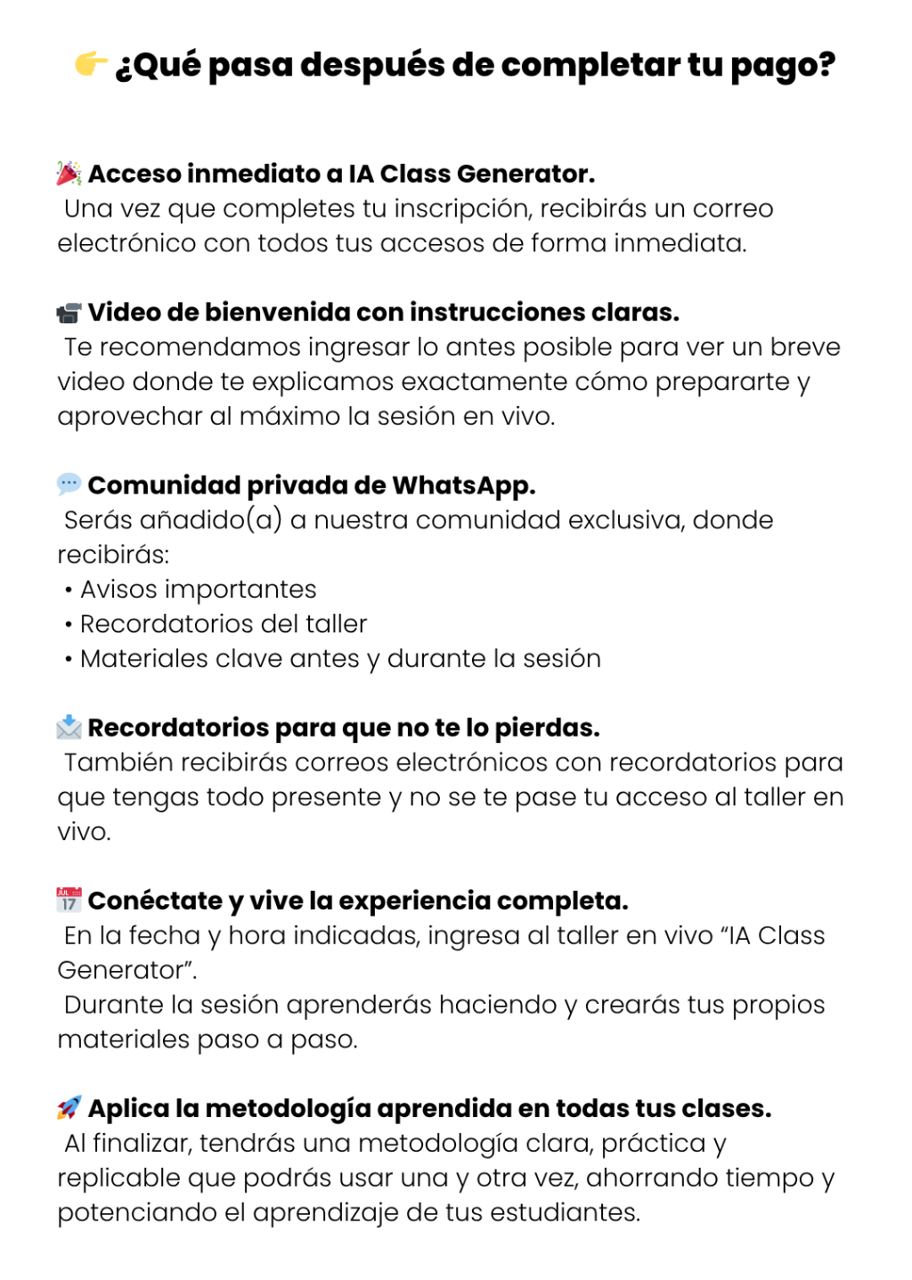 ¿Quieres repasar el taller con calma o no depender de tomar notas? Asegura tu acceso permanente a la grabación completa del taller, para que puedas repetir el proceso paso a paso cuando quieras. Ideal si deseas avanzar a tu propio ritmo.