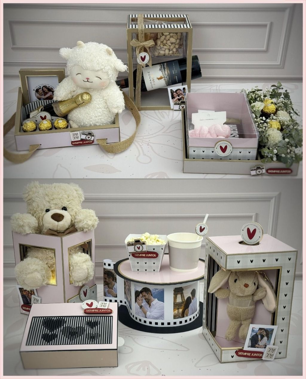 Celebra tus momentos especiales con nuestra encantadora colección de seis diseños únicos de cajas tipo bandeja, perfectas para sorprender a tu ser amado. ¡Cada diseño es un detalle especial que hará que este día sea inolvidable!