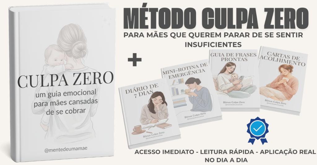 Método Culpa Zero – Guia Emocional para Mães Cansadas de se Cobrar, acompanhado de ferramentas complementares e práticas para começar ainda hoje.
