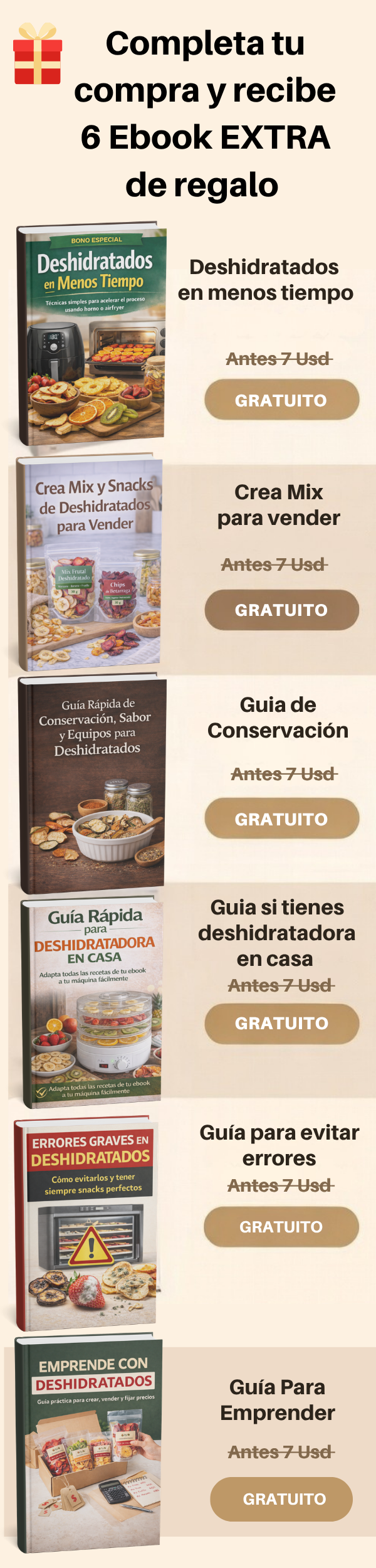 OPCIONAL:⭐ Llévate también el Recetario de Barras Saludables Imagina complementar tus deshidratados con barras naturales que se venden solas… Aprende recetas rápidas, sin complicaciones y perfectas para generar ingresos extra. 👉 Actívalo ahora y accede con descuento exclusivo.