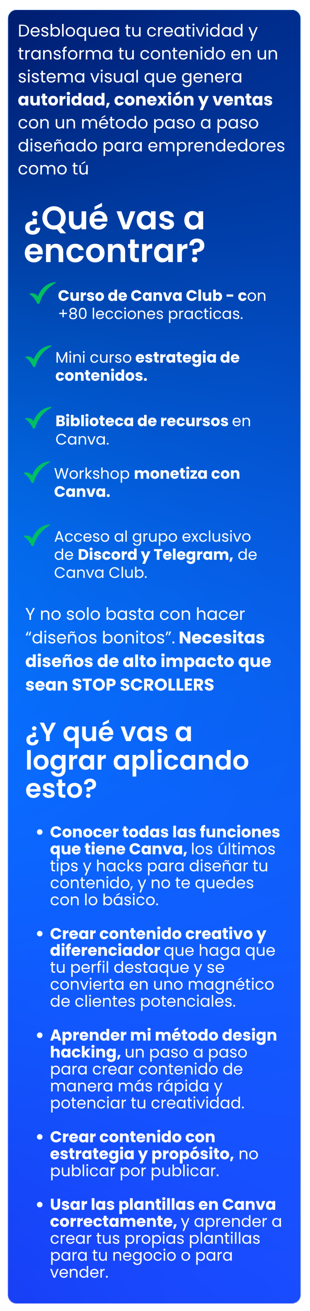 Estás por entrar a Canva Club… ¡Haz que tu contenido despegue desde el día 1 con el Mega Pack de Contenidos! Obtén +1100 plantillas listas para usar, diseñadas con estructura estratégica que vende. Incluye +400 plantillas por nicho (belleza, coaching, moda, etc.) y 15 landing pages editables. Ahorra horas de trabajo, pública con impacto y aplica el método sin empezar de cero. 👉 Editables con la versión de Canva Gratis. Agrégalo con un clic a precio exclusivo.