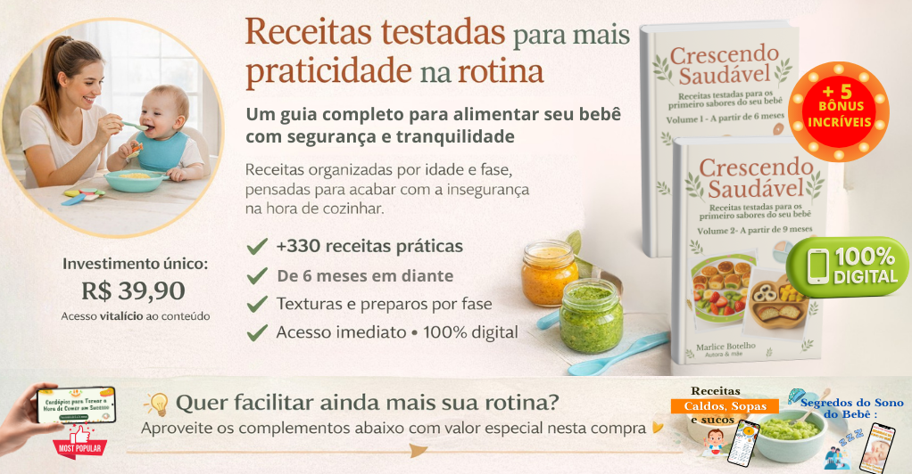 🎄 E-book "Crescendo Saudável: Receitas Natalinas para Bebês" em PROMOÇÃO ESPECIAL! Receitas festivas, práticas e nutritivas, feitas com ingredientes naturais e pensadas para cada fase do bebê (6+ meses). Inclui pratos principais com sabor natalino, saladas lúdicas e sobremesas saudáveis. Transforme o Natal em uma festa nutritiva para seu bebê! +3 Receitas Bônus! Compre agora com desconto e faça deste Natal um momento inesquecível!