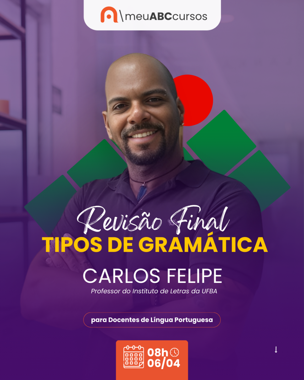 Acesso ao material até 30.05. Curso voltado para professores de língua portuguesa - IF Baiano, conteúdo TIPOS DE GRAMÁTICA. Ocorrerá em 6 de abril, com o prof. Carlos Felipe, da UFIBA + E-book com 30 questões comentadas conteúdos diversos.