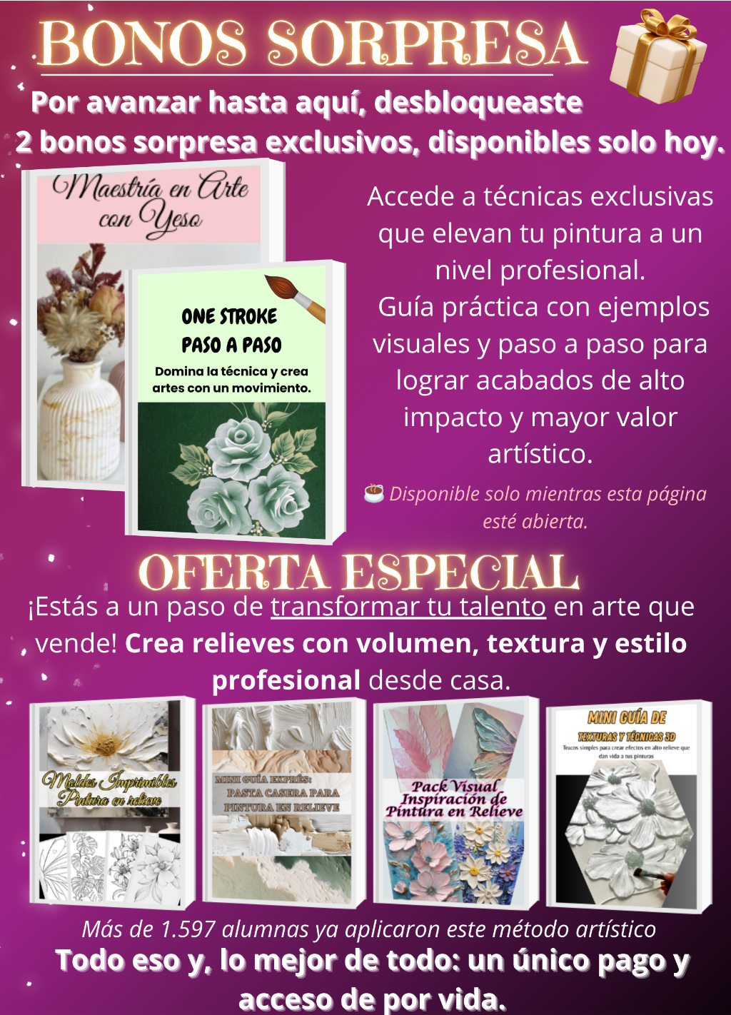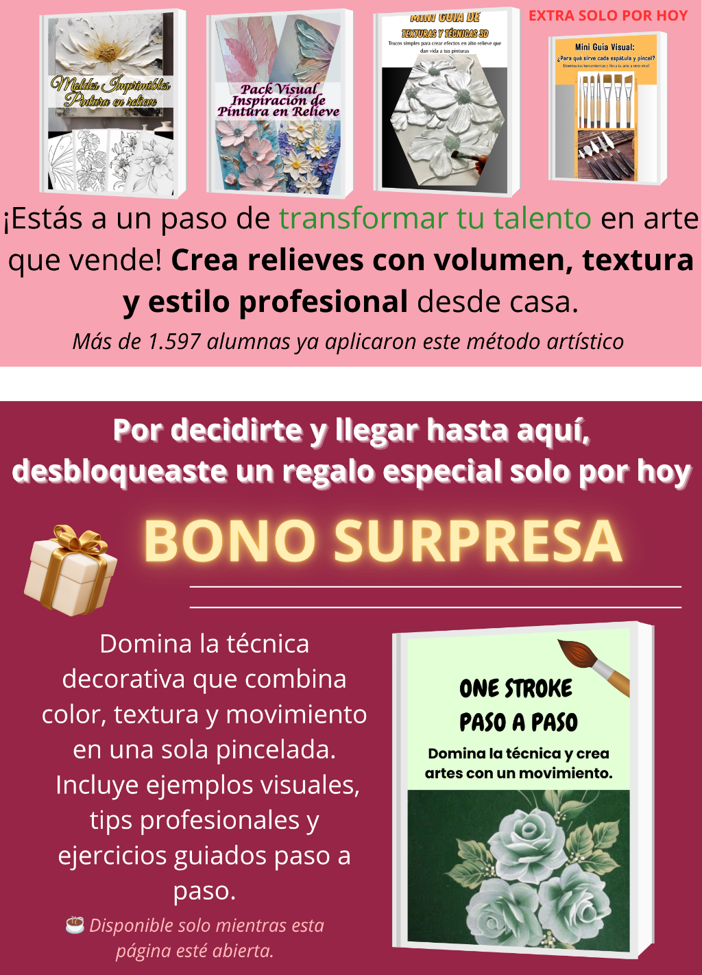 Paquete Completo: 6 Productos Adicionales con 40% OFF 💡 Eleva tu experiencia al máximo Con este Paquete de 6 productos adicionales obtendrás TODO lo que necesitas para crear, inspirarte y avanzar más rápido en tu camino artístico. Desde pastas caseras y fondos listos, hasta técnicas avanzadas como Puntillismo y One Stroke… además de un impulso diario para mantenerte motivada. 🔥 Solo hoy: llévatelo con 40% de descuento exclusivo y transforma tu aprendizaje en resultados reales.
