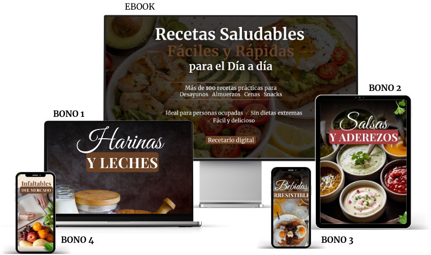 ✨ Una sola inversión que te ahorra tiempo, dinero y estrés en la cocina: +100 recetas y 4 bonos.