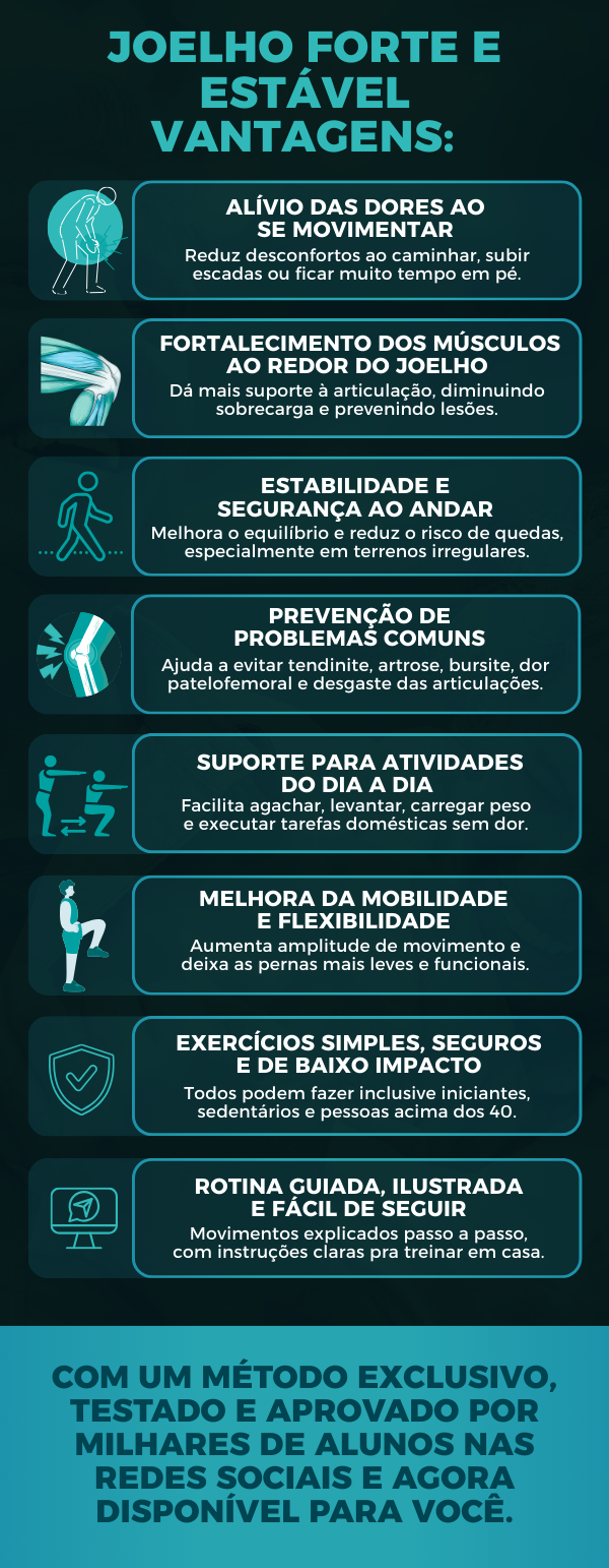 Ebook “Joelho Forte e Estável” - Diminua dores, ganhe firmeza e volte a se mover com confiança — em casa e sem impacto.