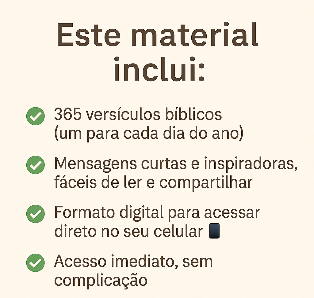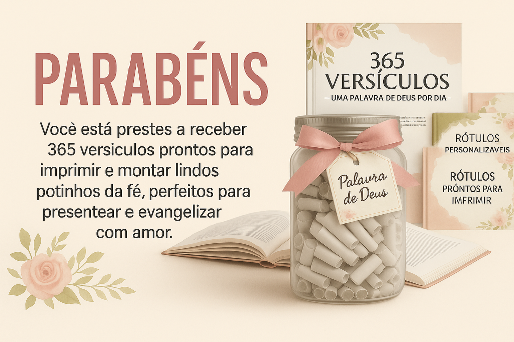 Inclua agora o ‘365 Motivos Para Agradecer’ e transforme seus dias com palavras que despertam fé, gratidão e leveza. São mensagens profundas e inspiradoras — para homens e mulheres — que ajudam você a enxergar o amor de Deus nos detalhes e cultivar um coração mais grato todos os dias. Um toque simples que renova a alma