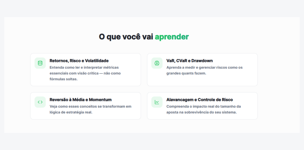 Frequência Sistemática + 8 Estratégias em Python Histórias que moldaram o trading moderno — de Thorp aos Turtle Traders, de Donchian a Jim Simons Como usar regras, probabilidade e risco para substituir opinião por método Fundamentos que sustentam qualquer estratégia: expectativa, drawdown, risco de ruína e assimetria