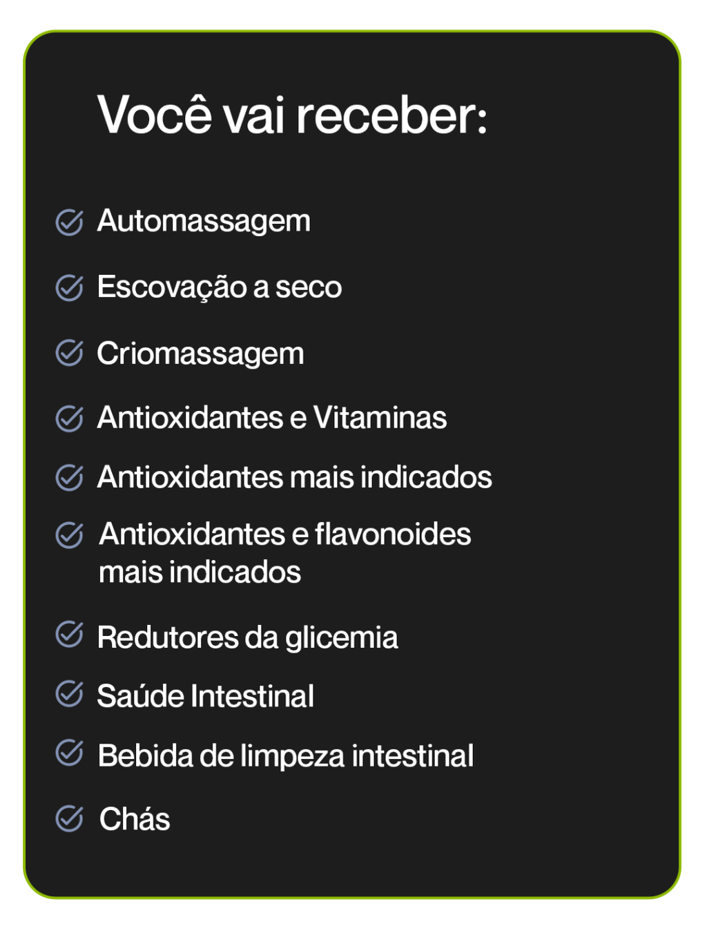 Estratégias alimentares anti-inflamatórias, simples de seguir, pensadas para desinflamar o corpo e melhorar sua resposta aos estímulos. ✅ Como aplicar o ciclo de carboidrato 5x2 para controlar o lipedema e potencializar a perda de gordura e o ganho de massa muscular. ✅ Como utilizar a agente virtual Amanda e acessar a sua dieta personalizada de ciclo de carboidrato desenvolvida junto a Nutricionista da nossa equipe.