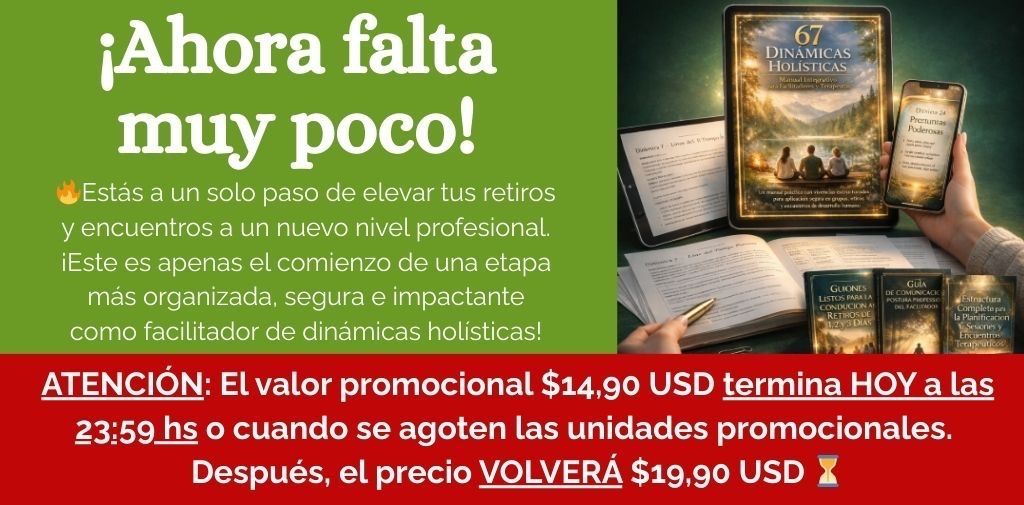 ¡OPORTUNIDAD ÚNICA DISPONIBLE SOLO AQUÍ! 16 HERRAMIENTAS PODEROSAS con métodos INDISPENSABLES para ayudarte a facilitar encuentros inolvidables y poderosos. ✨ Evita quedarte sin rumbo al aplicar las 67 Dinámicas Holísticas. Este kit te da la estructura exacta para conducir cada encuentro con seguridad, orden y autoridad desde el primer minuto. Sin improvisar ni dudas. Es el complemento esencial para lograr resultados reales. Agrégalo ahora por un valor mínimo y facilita como profesional.