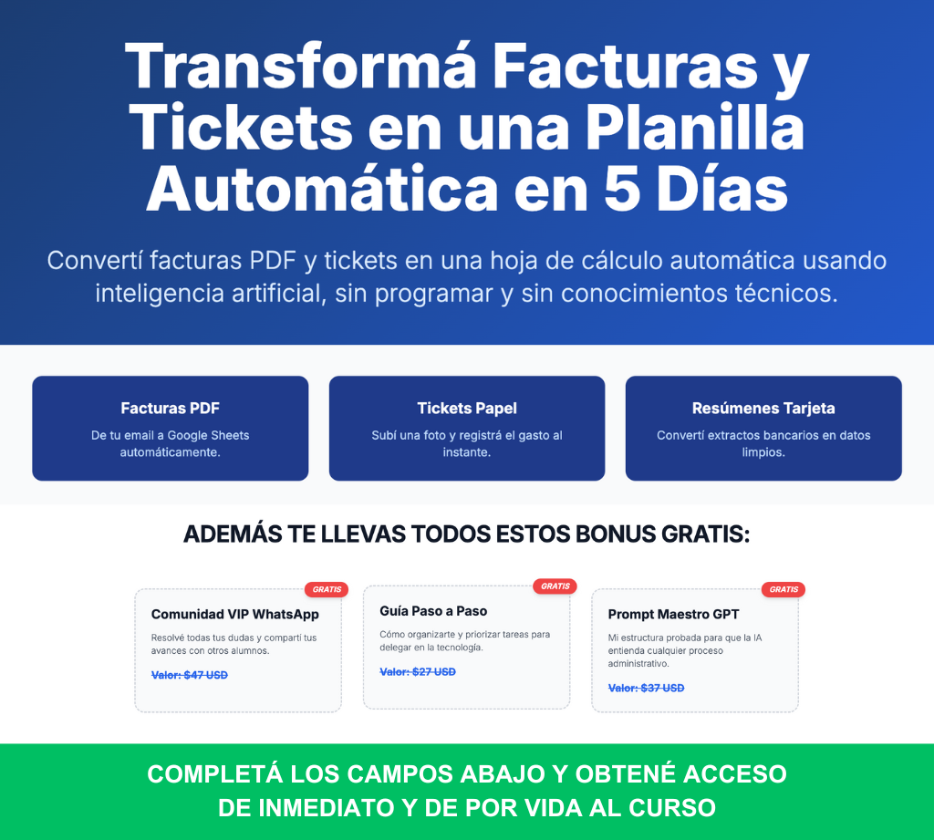 Aprendé a organizar tu Drive, Sheets, Documentos y enviar mensajes de whatsapp desde tu planilla — sin programación ni tecnicismos. Resultados prácticos desde el Día 1.