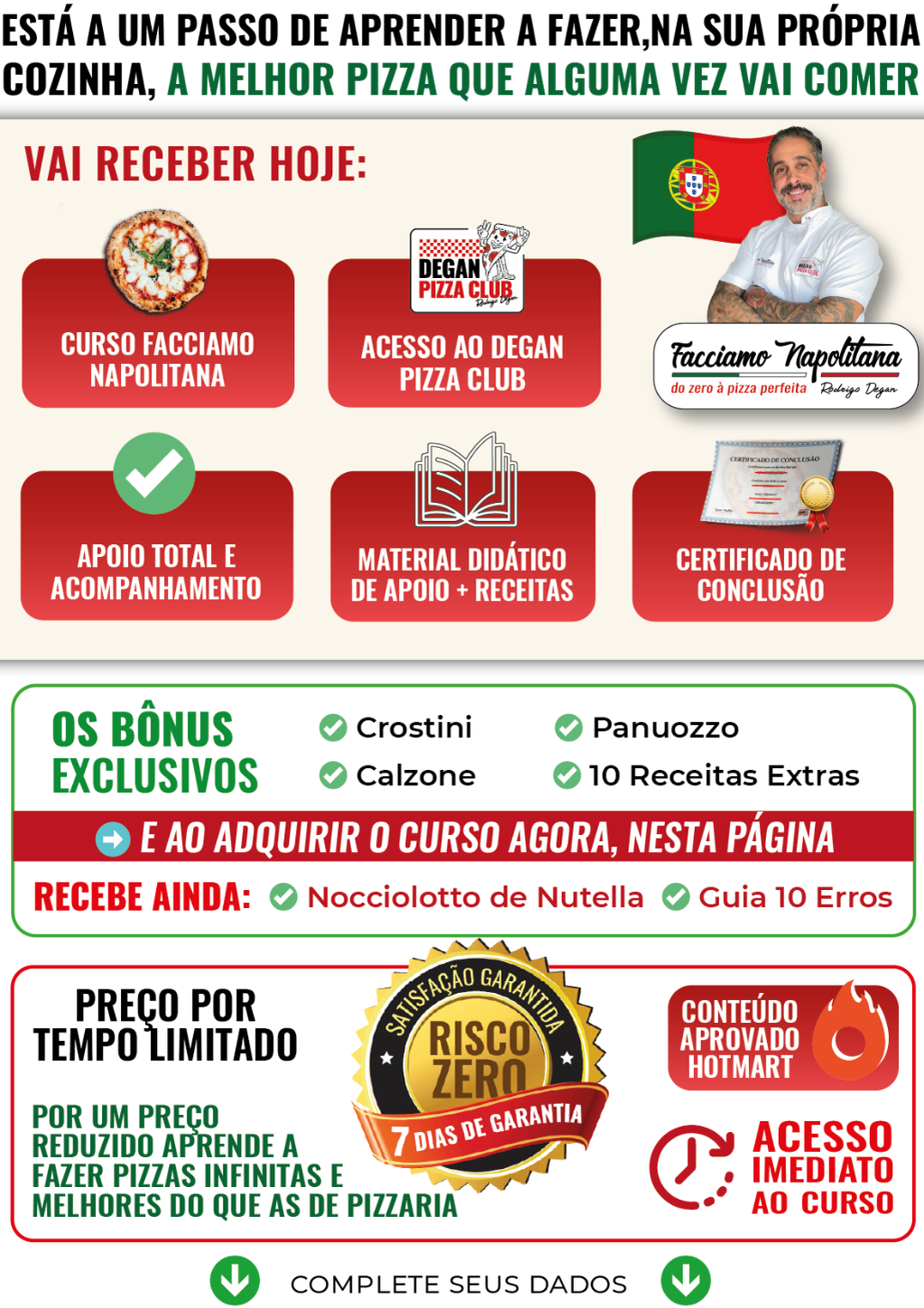 LEVA MAIS DE 130 RECEITAS DE SABORES PARA COBERTURA DA SUA PIZZA! 30 sabores exclusivos e detalhados, com passo a passo de montagem, incluindo ordem, finalização e até lista de substituições + 104 sabores da minha pizzaria (incluindo tradicionais, especiais, light, de vegetais, especiais e até doces, dividido por categorias). Materiais práticos e direto ao ponto. ESTE PREÇO SÓ É VÁLIDO PARA ADQUIRIR EM CONJUNTO, AGORA!