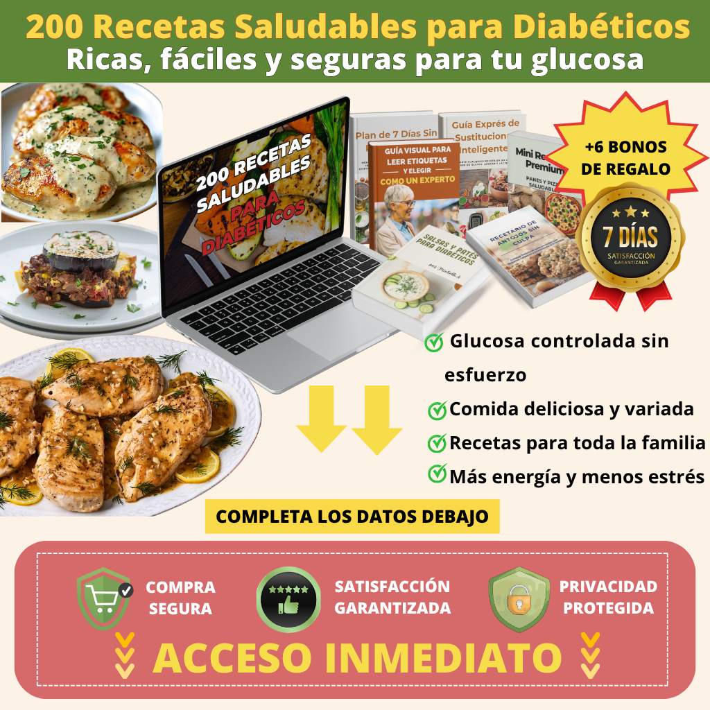 Recetas exclusivas para preparar desayunos llenos de energía, snacks crujientes sin culpa, platos nutritivos postres sorprendentes sin azúcar, sin gluten y sin lácteos. Perfecto para quienes viven con diabetes y buscan cuidar su alimentación sin dejar de disfrutar el sabor. ¡OFERTA EXCLUSIVA! SOLO DISPONIBLE EN ESTA PÁGINA. AGRÉGALA A TU ORDEN CON UN SOLO CLIC Y EMPIEZA HOY A VARIAR TU MENÚ DE FORMA FÁCIL Y DELICIOSA